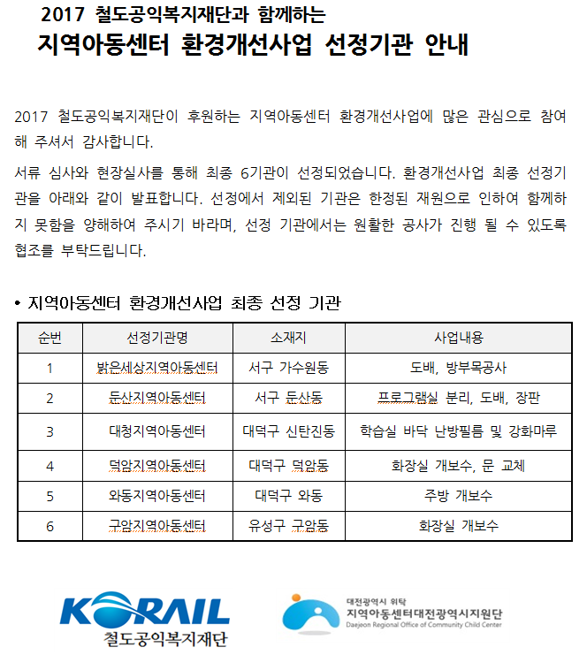 [공지] 철도공익복지재단 환경개선사업 선정기관…