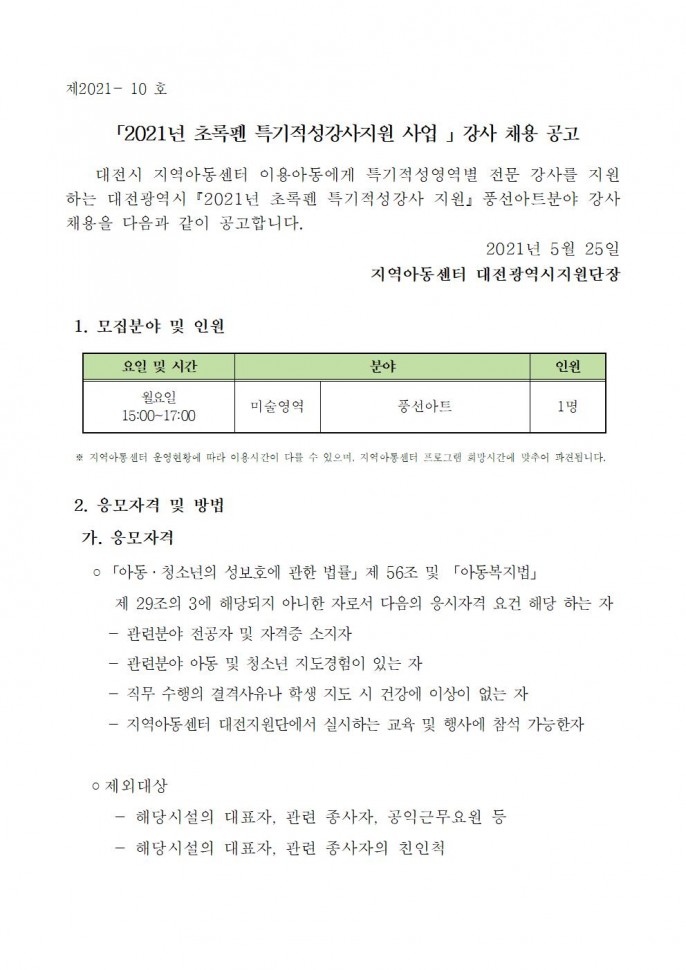 (공고) 2021 초록펜 특기적성강사지원 사업…