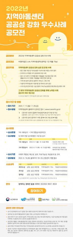 지역아동센터 공공성강화 우수사례 공모전을 아래와 같이 안내하오니 지역아동센터의 적극적인 참여 바랍니다.