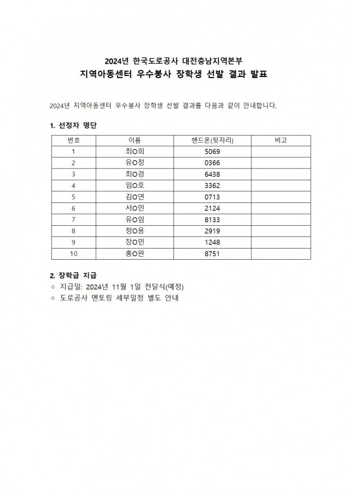 2024년 한국도로공사 대전충남지역본부 지역아동센터 우수봉사 장학생 선발 결과 발표